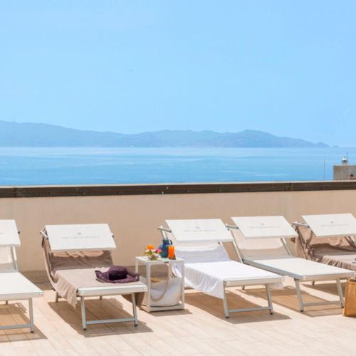 Yes, the top floor of the hotel features a panoramic terrace with sea views. Sun loungers are available for relaxation, along with a hot tub.